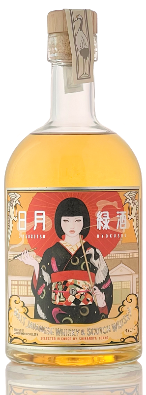 ウイスキーのスモーキーで強い印象を和傘と煙管を持つ女性で表現。若鶴酒造の鶴と、信濃屋のチェスの着物柄。背景は三郎丸蒸留所。飾り枠は鶴と煙をイメージしております。